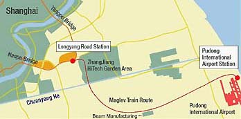 Transrapid is (arguably) the most developed maglev system in the world. Now in its 8th generation, (the TR08,) is the first high-speed (500 km/h) maglev system to deployed in a commercial environment. A 19.5 mile (30 km), double-track line connects Shanghai to the new Pudong International Airport. With a peak commercial operating speed of 267 miles per hour (430 km/h), each one-way trip has a duration of eight minutes. The main line of the project is a double-track system, with a 1.9 mile (3 km) single-track spur to the maintenance facility. |
