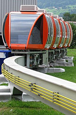 Chur, Switzerland. A new minirail system has been developed by PPH Transsystem AG of Lancut, Poland. Transystem is a handling systems provider with offices in several European countries as well as one in the USA. Bartholet Maschinenbau AG fabricated the train and track at their facility in Chur, Switzerland. The test train is slated to become a transport system in Taiwan. The minirail technology was also being developed for a proposed seven-kilometer urban transport for Rzeszow, Poland. The Rzeszow project would have featured larger trains, but was cancelled recently in favor of an expanded bus system. The so-called 'Catterpillar' monorail features eight cabins linked together on top of a steel straddle bogie system. Each cabin can carry up to six passengers.